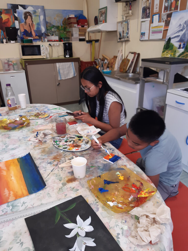 Lors des ateliers pour enfants, Mayanne Mackay, artiste pratiquant la peinture sous verre, propose aux petits adhérents de partager avec eux son savoir et ses techniques.